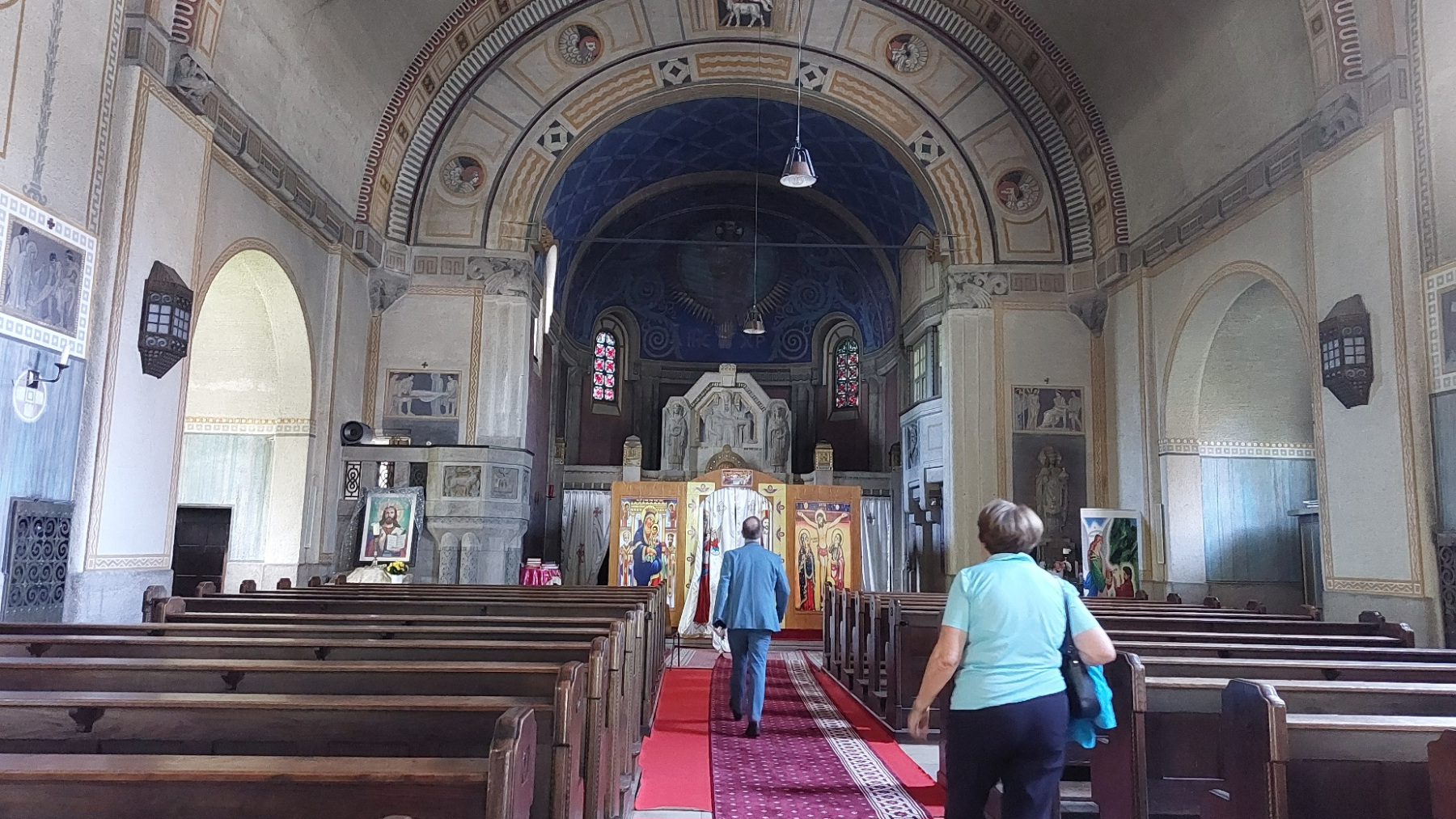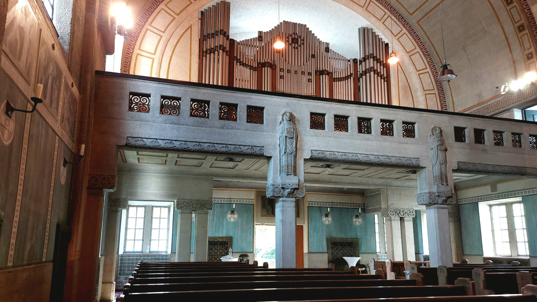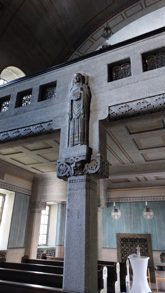Im Jugendstilpark konnten wir die sonst verschlossene Kirche Maria Sieben Schmerzen besichtigen. Matthias Riedel-Rüppel, der Intendant des Kleinen Theaters Haar, öffnete uns die Türen zu dem einzigartigen Kirchenraum. Maria Sieben Schmerzen, in den Jahren 1911/1912 errichtet, ist ein ganz besonderes Jugendstil-Schmuckstück. Stuck-Schüler Wilhelm Köppen schuf mit seinen Malereien ein besonders schönes Zeugnis des Münchner Jugendstils. Von der Gestaltung und den Farben waren wir beeindruckt, und auch von den Gedanken, die dazu geführt haben, dass die Kirche sonntags wieder mit sakralem Leben gefüllt wird.