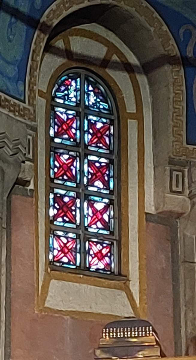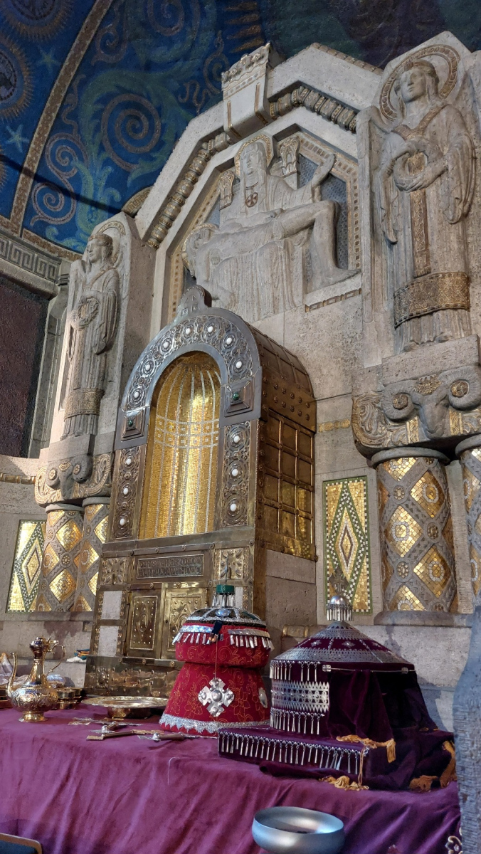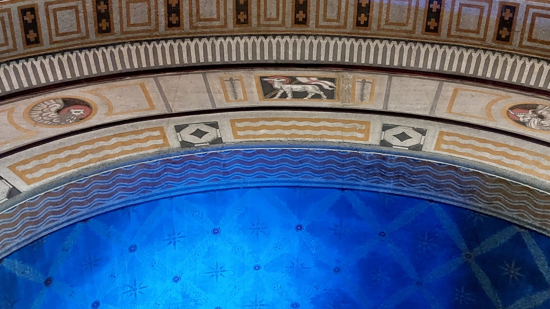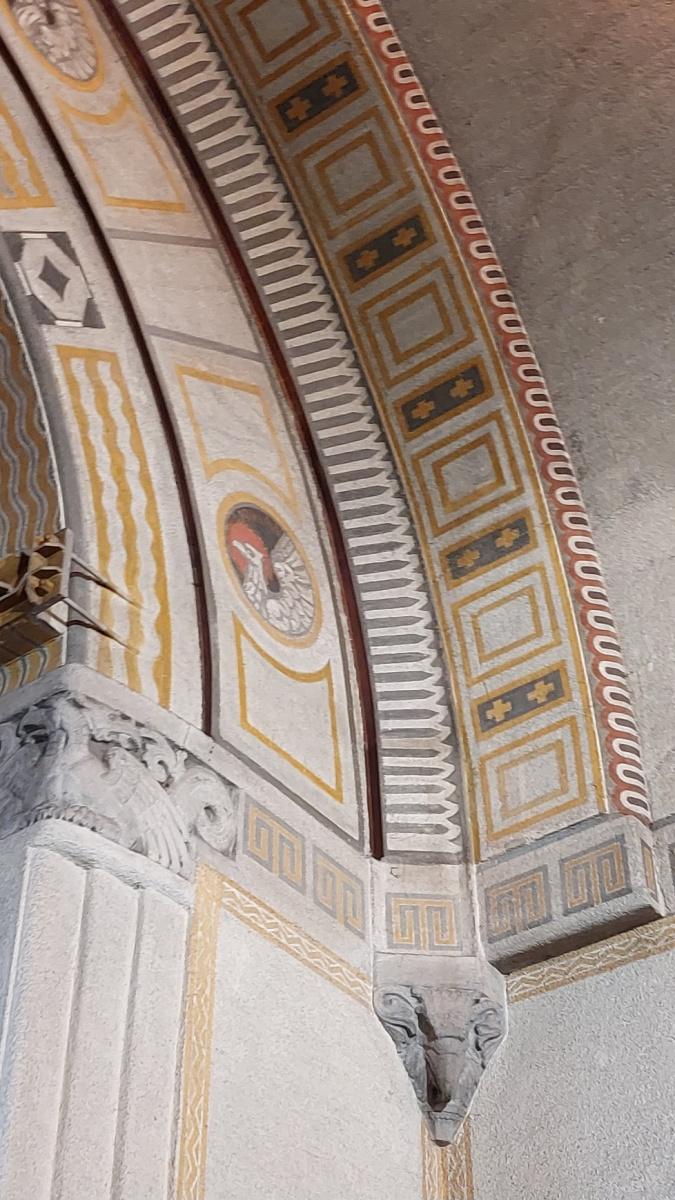 Im Jugendstilpark konnten wir die sonst verschlossene Kirche Maria Sieben Schmerzen besichtigen. Matthias Riedel-Rüppel, der Intendant des Kleinen Theaters Haar, öffnete uns die Türen zu dem einzigartigen Kirchenraum. Maria Sieben Schmerzen, in den Jahren 1911/1912 errichtet, ist ein ganz besonderes Jugendstil-Schmuckstück. Stuck-Schüler Wilhelm Köppen schuf mit seinen Malereien ein besonders schönes Zeugnis des Münchner Jugendstils. Von der Gestaltung und den Farben waren wir beeindruckt, und auch von den Gedanken, die dazu geführt haben, dass die Kirche sonntags wieder mit sakralem Leben gefüllt wird.