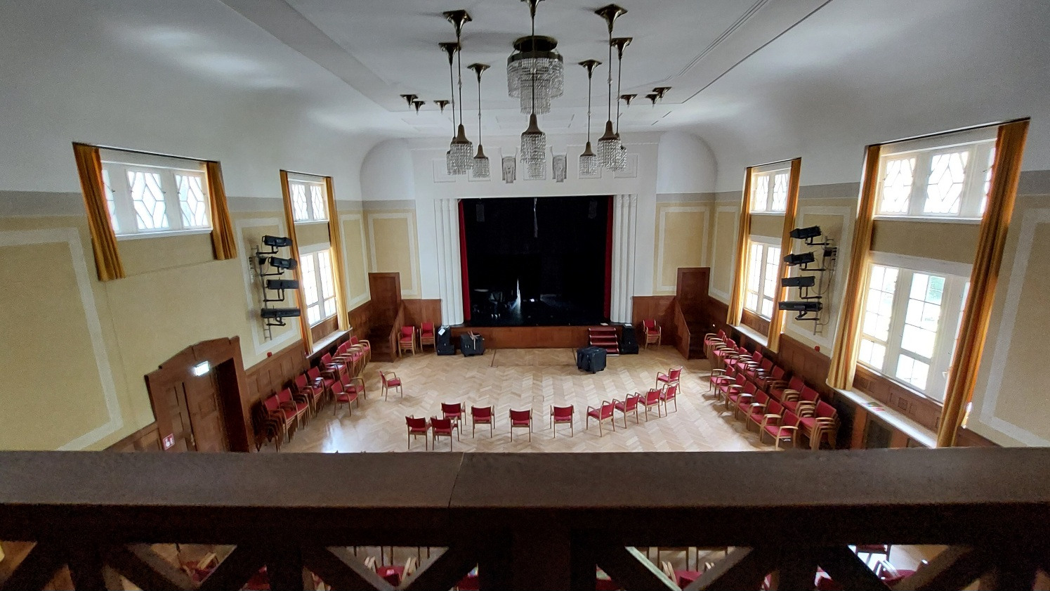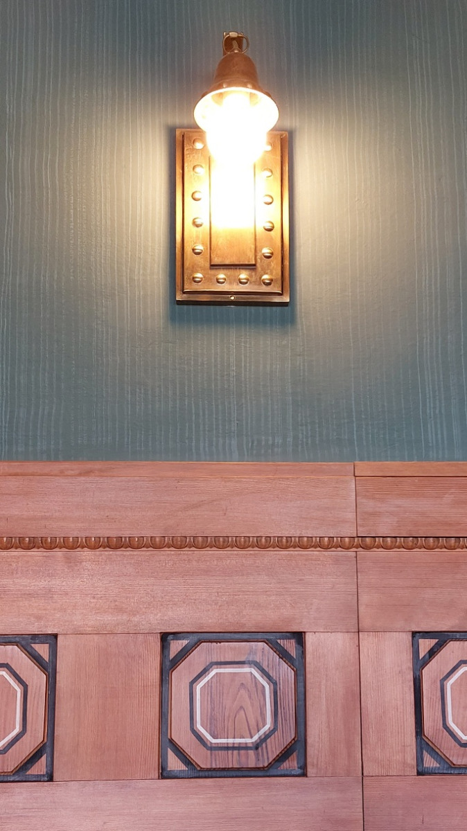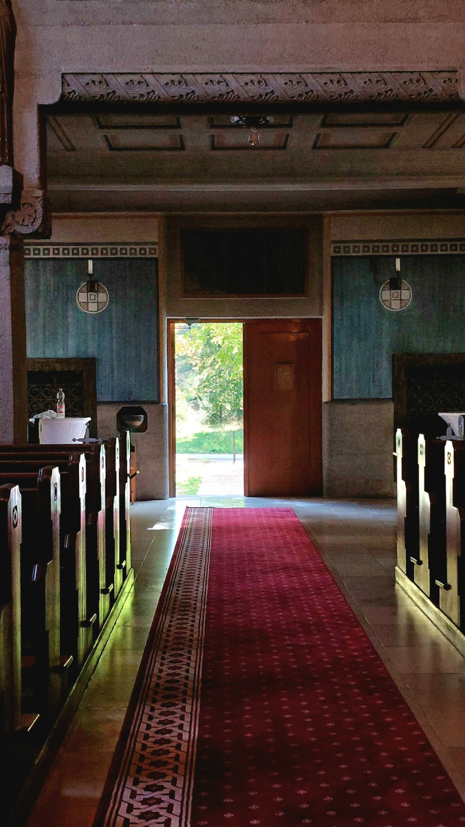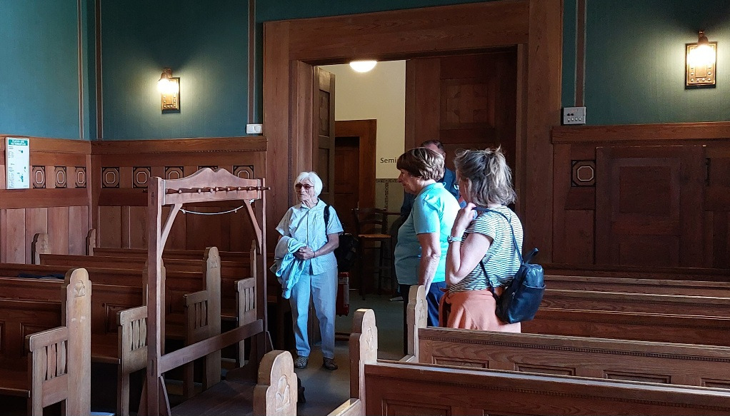 Dazu passend besichtigten wir im Anschluss die evangelische Kapelle im ersten Stock des Kleinen Theaters. Der Betsaal ist ebenfalls durchgängig und detailreich im Jugendstil gehalten. Er sollte den Protestanten auch in Haar II eine Möglichkeit zur Andacht bieten und rechtfertigte damals zugleich den Bau des Kleinen Theaters. Hier erzählte uns Matthias einiges über die Entstehung (1900-1912) der Pflegeanstalt Eglfing, für die der Psychiater Friedrich Vocke die moderne Planungsgrundlage erarbeitet hatte.
