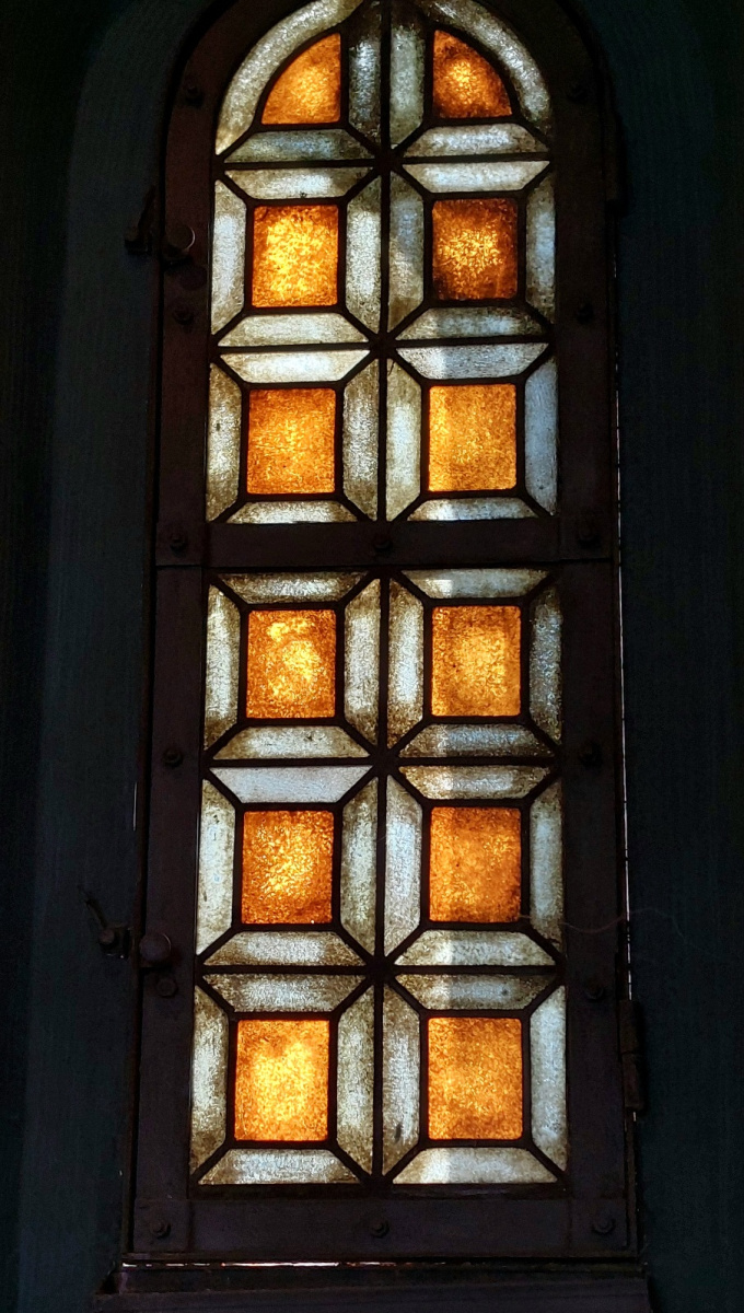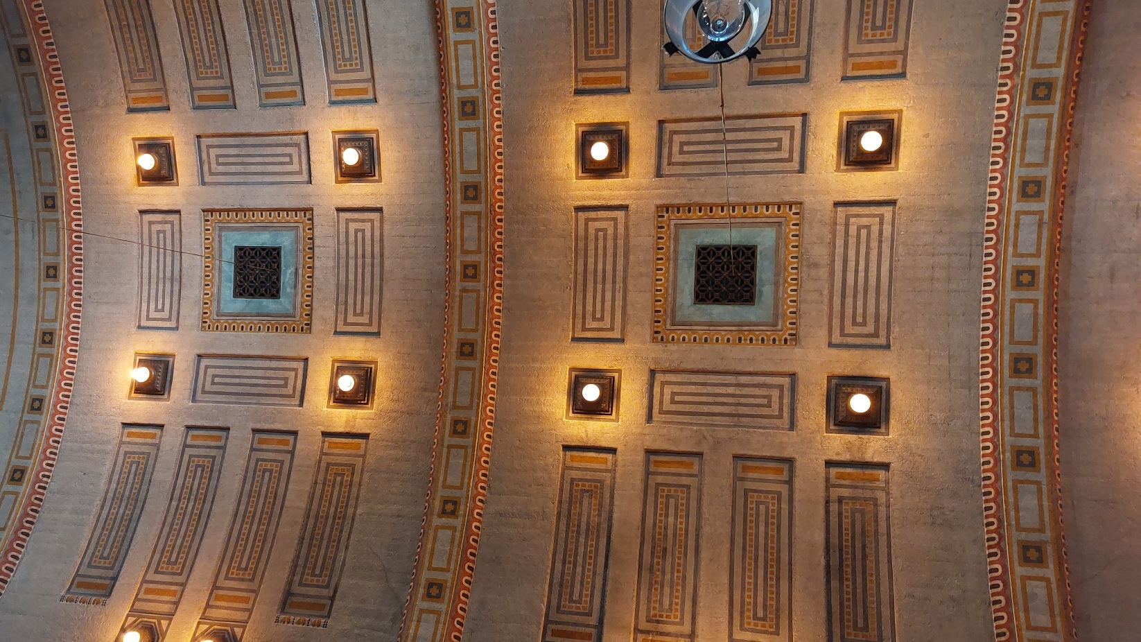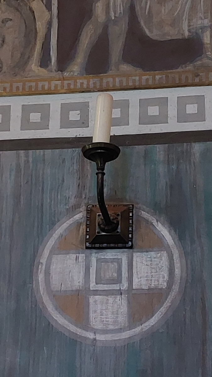 Dazu passend besichtigten wir im Anschluss die evangelische Kapelle im ersten Stock des Kleinen Theaters. Der Betsaal ist ebenfalls durchgängig und detailreich im Jugendstil gehalten. Er sollte den Protestanten auch in Haar II eine Möglichkeit zur Andacht bieten und rechtfertigte damals zugleich den Bau des Kleinen Theaters. Hier erzählte uns Matthias einiges über die Entstehung (1900-1912) der Pflegeanstalt Eglfing, für die der Psychiater Friedrich Vocke die moderne Planungsgrundlage erarbeitet hatte.