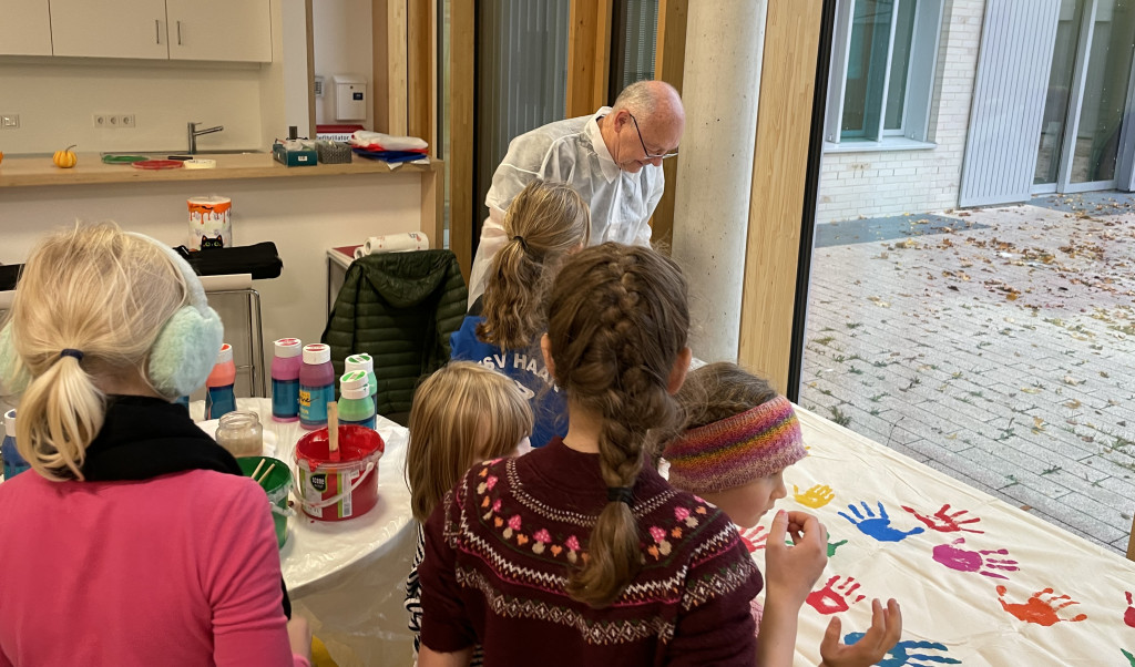 Beim Abholen ließen sich viele Eltern und Kinder von Dagmar Richter und Karl Hertje motivieren, ihren Handabdruck für die neuen Haarer Einkaufsdascherl abzugeben. „Zunächst sollten die helleren Farben Gelb und Magenta auf die Hände, dann Rot, gefolgt von Grün und Blau“, erzählt Dagmar Richter. „Ein kleiner Bub wollte nur Grün – und das gleich fünfmal. Ich glaube, er fand das Gefühl der weichen Rolle so schön.“